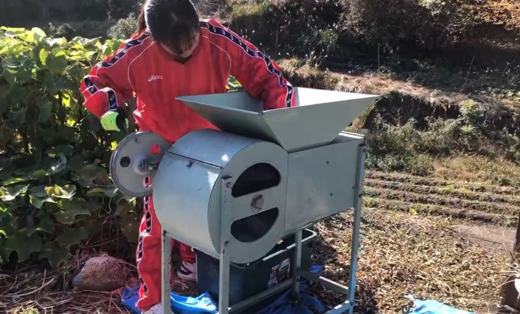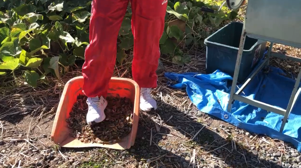 まずは「足踏み脱穀機」を使い、干していた大豆の枝と鞘を分ける作業。